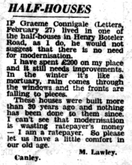 My Aunt and Uncle were bombed out in WWII and after the war they were offered a house in Henry Boteler Road which they accepted. These were all new houses of one storey with a flat roof. The idea was to get houses built to house all those bombed out, so it was decided to build one storey and add another later. I can remember going to see my aunt and uncle as a child and my younger brother and I were intrigued by the fact that there was a stairs built in ready, a stair going nowhere at that stage. Of course those stairs are gone now as it was eventually decided just to put the roof on and make them bungalows. Can anyone remember when they did that please?