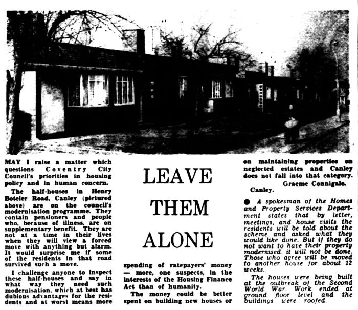 That was quick, thank you very much both of you. 1973 great. Even a document Wow!! Thank you again. That really was special. I suppose the ones at Radford had their own document as they are not mentioned on this one. I understood as a child the Canley ones were not alone that there were other developments in the city of the same sort. Remember thinking what a sensible idea. To the amusement of my aunt we several times asked to see those stairs!! They had a door from the front hall. She had a green stair carpet on them if I remember rightly. Not that she ever went up there, but she liked things to look nice. I do not suppose anyone has a photo please, we did not take photos as we do now. I tried Google maps but I could not download it. So many lovely memories of two wonderful people, my aunt and uncle.