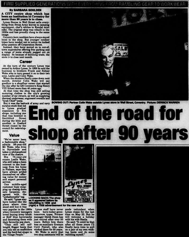 Thanks to all for your responses. Particularly Garlands for the newspaper article as I didn't know the history of Lynes. It mentioned my Uncle 'Squib' Peutrell and that he had been a part-time fireman. I remember as a 'ween' being fascinated by his firemans axe and I think he kept a helmet at home too. He was attached to the old Canley Fire Station and they had a great social scene including a fete every year at which my sister and I and my cousins all had a great time. Somewhere in my 'archives' I've got a copy of an article from the Coventry Telegraph marking 'Squib's' retirement. He was indeed the mature gentleman Slim refers to who had been there all his working life after war service. He lived in Sherbourne Crescent when married. Interesting that the subject moved on to boots as I also got my first pair of hiking boots there and I'm sure they were second hand! At least they'd been broken in and they lasted me for 10 years of reasonable use. Going up Snowden (sorry 'Taffs' - Yr Wyddfa) was their finest hour. Doc Martens is a whole other subject - wonderful when patrolling long service in hard stations!!