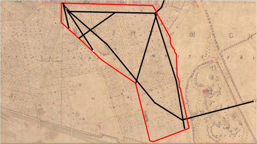 Many times I've heard about the two parks. The Great Park had a logical outer boundary but the Little Park has been an unknown. Handily though, we discovered that there was a map in the Aylesford Collection. Using landmarks I've tried to tie it to the 1850 map. I'm very much guessing that the south gate was in line with the Charterhouse road. Black lines were paths and the red line was the rough boundary of the park. I will accept corrections from Rob etc if they have other ideas.