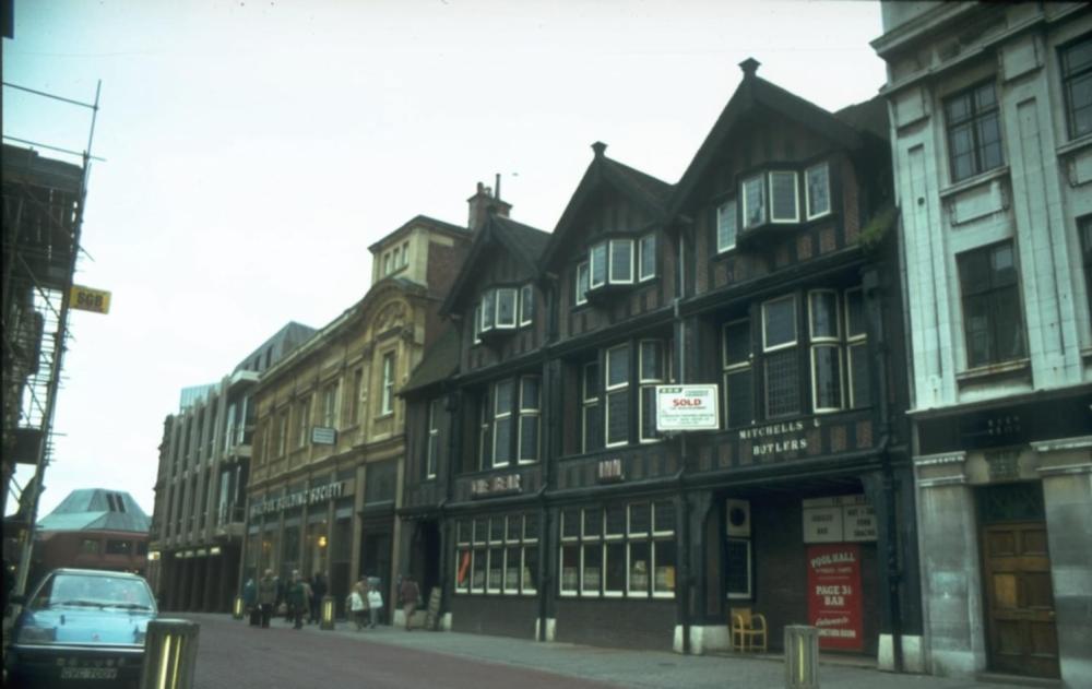 This is a (not very good) photo of the Greyfriars Lane/High Street junction before the Lloyds building was built. It shows the side of the Waters building. |