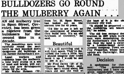 Hi all, Have been wondering recently as to which tree is the oldest in Coventry. It's probably not the oldest tree in Coventry - but the black mulberry tree (Spon Street/outside the Odeon cinema) is the oldest tree in the inner city (Coventry.gov.uk, 2018 page 13). Could the oldest tree be an ancient oak or perhaps a churchyard yew tree? Any ideas? Thanks, Luke. Thumbs up