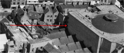 Rethinking, I guess that it's the side of the Odeon. I think the view follows the red arrow but more buildings had been demolished. So essentially this is Jordan Well. It's after the Dunn Cow had gone.