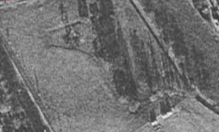 But there's another feature, the oblong nearest the lane to Charterhouse. Just a modern field boundary? Except it's visible in this aerial photo of war damage (thanks Robthu).