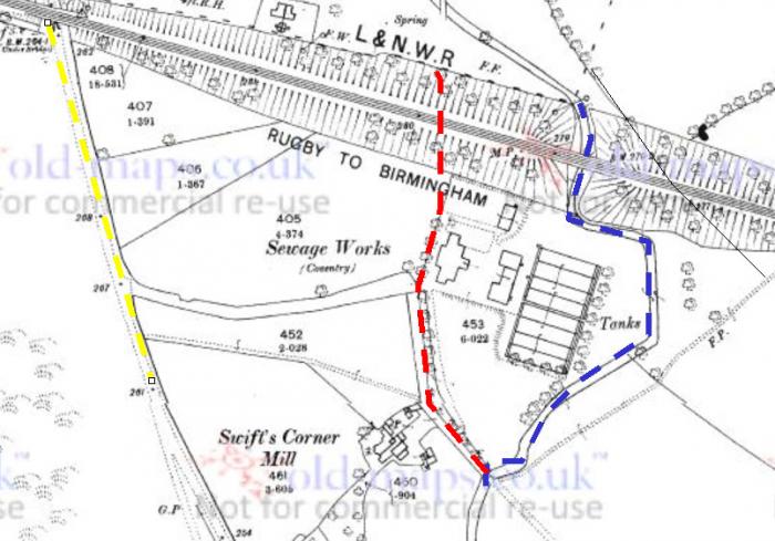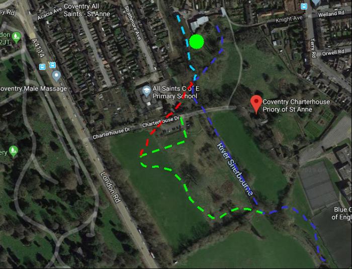 As part of my ongoing exploration of Coventry's waterways and mills I found an anomaly at Charterhouse. The area south of Gosford Gate used to have many meanders that were subsequently removed. At least one was blocked up by the construction of the railway and the river channel going under the arches is quite probably new. The oldest maps chart a few of the original loops but the river in front of Charterhouse is suspiciously straight in every map I've seen. Of course the monks themselves could have created the current channel as other monks did across Coventry and it seems a roll of the dice whether the linear mill race or the original channel remained after the mills were removed. I've mentioned that I'm missing a mill and while the most likely answer is that the mill was actually the same as another mill (they had many names over the years), there is a possibility that my anomaly is the missing mill pond. Here's a map of the anomaly. It's the wiggly line starting middle left and ending with bushes/trees bottom right. Probably it's the remains of a stream bed draining off the common (now the London Road cemetery).