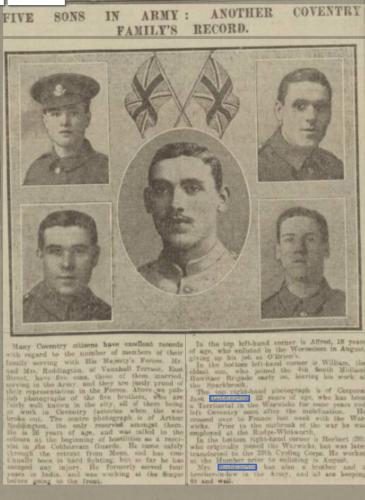 Annewiggy. It's not the missing child unfortunately but the story is like something out of a Dickens novel. Sarah had sent Ellen Elizabeth [aka Nellie] to my grandma's house for food. My grandparents [William & Florrie Oldham, nee Reddington] and both sets of my great grandparents [Oldham & Reddington] all lived in Vauxhall Terrace, between East Street & Days Lane, Hillfields. Vauxhall Terrace only had 10 houses and my ancestors lived in 3 of them. The other item you found certainly is my family. Sarah had 5 sons, a son-in law and the husband of the sister-in-law of my grandmother, who all went to war. Only Sgt John [Jack] Reddington and the husband [Bertie Hutt, brother of Coventry VC recipient Arthur Hutt] failed to return. Sgt Reddington's wife Hannah donated an iconic six-sided bench in his memory to the Herbert Gallery when it opened in 1960. She also left monies in her will for its upkeep. Unfortunately, someone at the Herbert authorised its disposal. Anyway thanks for your input and I will continue my research using the tips provided. Thanks everyone.